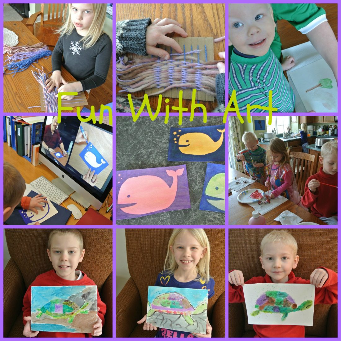 Today our focus is on art.  We have done WAY more art this week than we usually do!  Three of the kids did a weaving project to go with our Josefina (American Girl) unit study– I'll be sharing all about it when we finish in a few weeks.  We did watercolors of whales (a See the Light project) and of turtles (to go with a review of Tadeo Turtle which will be coming soon).